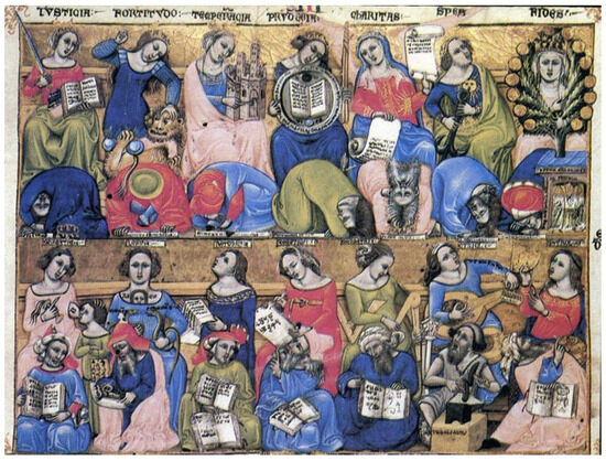 Temperance’s chastity was emphasized again with a new depiction in the 14th century: “Chaste Temperance 2”. In this case, Temperance holds a castle and one or more keys. La Canzone delle Virtu e delle Scienze by Bartolomeo di Bartoli (ca. 1349, Chantilly, Musée Condé, ms. 599, fol. 3) (Figure 5) shows Temperance locking a tower with a key. Some leaves with inscriptions of Temperance’s virtues arose from this tower. A text (vv. 106–126) completes the depiction: