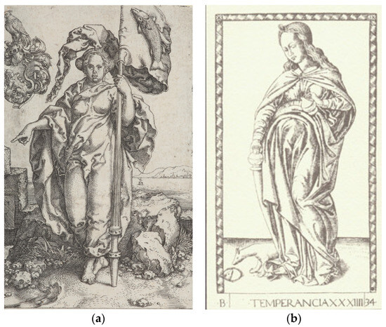 (a) Temperance, The Virtues, Heinrich Aldegrever, 1552; (b) Temperance, Mantegna’s Tarot, 15th century.