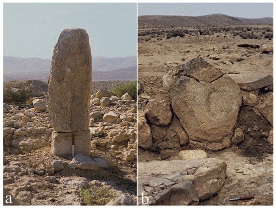 The earliest maṣṣeboth, both from the Negev Highlands: (a) Rosh Zin, excavated by D. Henry (the main part was found fallen); (b) Har Harif, excavated by N. Goring-Morris, incorporated in a wall.