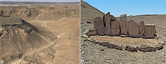 Har Tzuriʻaz XXI, Southern Negev: (a) An open-air sanctuary next to a band of trails; (b) A closer view.