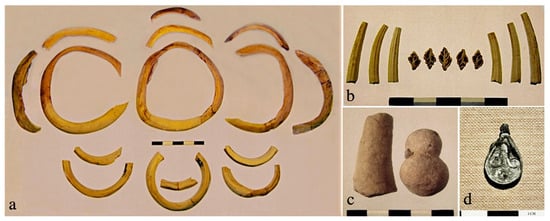Finds from maṣṣeboth shrines. (a–c) From Wadi Watir, eastern Sinai: (a) Shell bracelets, (b) Dentalium and cut small conches; (c) fossils. (d) From the top of Maʻaleh Jethro, southern Negev, an Iron Age silver pendent.
