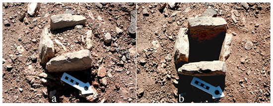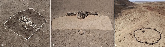 Jebel Ḥashem al-Taref, eastern Sinai, three examples of “stone drawings” built next to pairs of open-air sanctuaries: (a) Excavated; (b,c) Unexcavated, dark stones—vertically set, light stones—fallen.