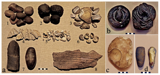 Examples of finds from open-Air sanctuaries: (a) Har Shani, the Eilat Region: 1. Quartz pebbles, 2. Hematite nodules, 3. Colorful flint, 4. Tridacna shell fragments, 5. Red Sea various shells, 6. Fossil shells (Exogyra sp.), 7. Quartzite and flint phallic-shaped stones, 8. Colorful sandstone; (b) Har Tzuriʻaz, southern Negev, flint stones of peculiar forms; (c) Naḥal ʻEteq, the Eilat Region, large tabular scraper; (d) Har Tzuriʻaz, basalt and flint axes.