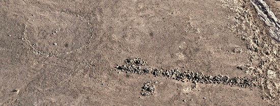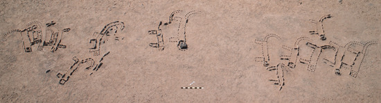ʻUvda Valley Site 6, “stone drawing” of 15 leopards and one oryx, next to an open-air sanctuary, a vertical view (small stones indicate reconstruction).
