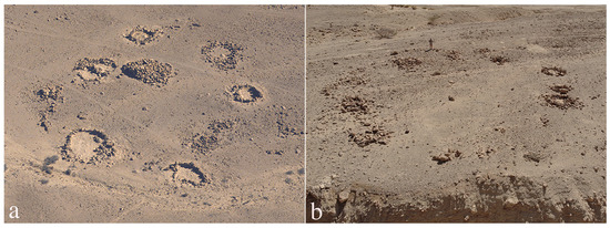 Many open sanctuaries are circular, (Figure 21c, Figure 28(3a–d) and Figure 33). Most of them are 6–18 m in diameter, but tiny circular sanctuaries are also known, ca. 3 m in diameter (Figure 33a), as well as large circular cult enclosures up to 70 m in diameter (Figure 33b).11 Stone alignments are attached to most of the circular sanctuaries, mainly in the form of “ladders”, which are chains of square cells made of a single line of stones or of small flagstones set vertically into the ground (Figure 34a,b, Figure 36a and Figure 42). Their length ranges from a few meters to 78 m, and they present one of the combination of lines and circles.12