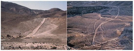 Historical and archaeological studies often refer to ancient roads in the context of biblical times, the Roman period, the Nabatean trade routes, etc. Road maps accompanying publications indicate connections between sites and between countries, with the routes drawn in an approximate or assumed manner, sometimes without taking into account the local topography or actual remains of the roads. On the desert surface, however, the ancient roads are clearly visible, so there is no need to guess their routes. An ongoing, incomplete survey of ancient roads in the Eilat region has brought up a complex map of many roads, despite the rugged, mountainous nature of the area (Figure 1). A partial survey of ancient roads in other regions of the Negev presents a similar picture (Figure 2). Nevertheless, a view from the air reveals many more roads, so that it is difficult to cover them all by a ground survey. The common appearance of an ancient road on a flat terrain is a “band of trails”, i.e., many parallel trails spread over a strip of varying width. Some roads are 100 to 200 m wide (Figure 3, and see Avner 2016), but many others are only a few meters wide. A wide band of trails certainly indicates a major route, but a narrow one does not necessarily indicate a local, ephemeral trail. One example for the latter is the section of the “Incense Road” (a modern name), on which large Nabataean camel caravans walked, arriving from South ʻArabia during the 4th century BCE to the 3rd century CE. Despite that, the band of trails was narrow, up to 10 m wide (Figure 4), all the way from Orḥan Mor (Muyat ʻAwad) in the ʻArabah to the town of ʻAbdat in the Negev Highlands (Figure 2), ca. 70 km long. When the trails approach a topographical obstacle, namely, a slope, they converge to a narrow, winding trail (Figure 5). On these ascents, remains of labor investment are often observed, i.e., clearing rocks, building retaining walls and even cutting the rock (Figure 6 and Figure 7).