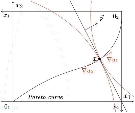 Here, one considers a hypothetical economy populated by two consumers who trade two commodities. Each point in the rectangle (the so-called Edgeworth box) epitomizes a distribution of each good to households whose preferences are captured by the (red) indifference curves. The “Pareto curve” refers to the set of allocations which are “optimal” in the sense of Vilfredo Pareto, i.e., such that it is not possible to reallocate the two goods in such a way that both agents are weakly better off and none of them is worse off. In the setting of consumer preferences that can be represented by differentiable utility functions, this amounts to requiring that the gradient of each player’s utility be collinear to the price vector, p. The x point represents one allocation of goods which is such that every consumer would agree with it given the prevailing price vector, p, and their initial allocation—it is usually called a “Walrasian equilibrium” in tribute to Léon Walras, who is perhaps the first engineer who tried to prove that such an equilibrium exists. The “miracle” of the “invisible hand” is that this x point lies precisely on the Pareto curve. In other words, it is Pareto-optimal. The quest of individual interest leads therefore to a mutually beneficial agreement (often identified with the Common Good).
