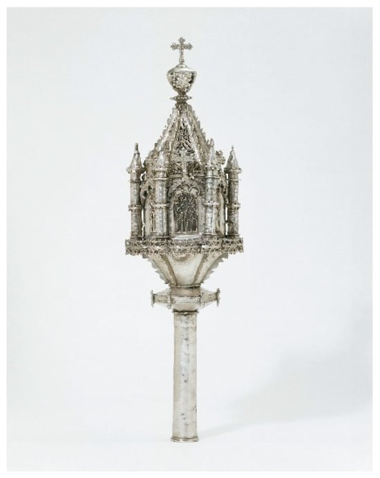 | 39 | Examples of which can be found in Museo Lázaro Galdiano, Madrid (Inv. n. 1.466, 1.467, 1.714, 2.861, 2.862, 2.896, and 2.897), and in the Victoria and Albert Museum, London (M.256-1956). The pair of verge heads in London was long dated to the period around 1500 (Oman 1968, p. 6, no. 18). Its features, however, may indicate a nineteenth-century manufacture, a time when many Gothic-inspired pieces were produced (Cruz Valdovinos 2000). I am grateful to Kirstin Kennedy from the Victoria and Albert Museum for sharing her insights concerning the verge heads and raising the question of their dating. |