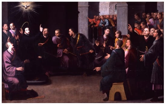 Serrão 1993, p. 88). While all the seated men make conversational gestures with their hands, Francisco raises his right hand with the index finger pointing upwards, such that his hand is higher than any of the heads of the seated bonze. His head is encircled by a slim golden ring to indicate his sanctity and the dove of the Holy Spirit hovers above him, signaling the heavenly inspiration behind his discourse. All the other men present, either massed on the balcony or behind the seated men, are ostensibly Japanese, with the two standing in the right foreground probably being samurai as the topknot on the nearest man, shown in profile, is visible and they appear to have swords at their waists. One of the two samurai seems to be pointing directly at the Holy Spirit. There is no evidence of the Buddhist nuns reported to attend Francisco’s gatherings, though the small figure on the left of the group on the balcony may conceivably be female.