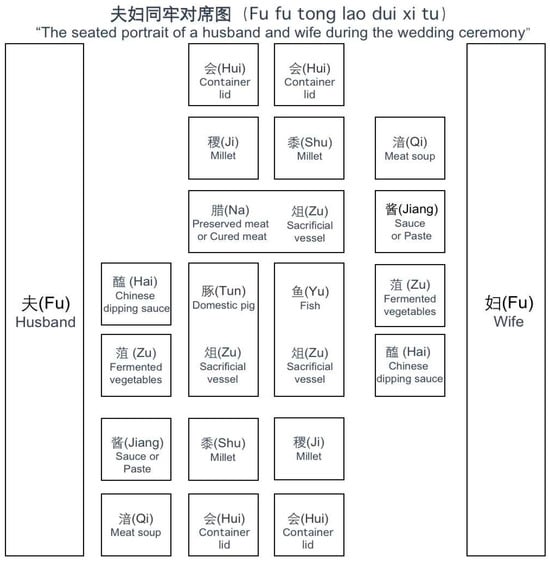After the bride arrives at the groom’s house, both the groom and bride enter the ceremonial hall. Before performing the ritual, the female servants of the groom’s family exchange water for the couple to cleanse themselves. After cleansing, the couple participate in their first meal together, symbolizing their union as one. The celebrant uncovers the wine vessel and places the tripod to the south of the altar. The attendants place the utensils, including the knife and meat dish, beside the tripod and the sacrificial meat on the dish. The celebrant sets out the condiments, and the attendants place the sacrificial dishes to the east of the meat dish, followed by the fish and rabbit and the condiments of Millet dun, meat sauce, and broth for the bride (Figure 2). The groom’s attendants arrange the seats and the food and invite the bride to sit with the groom to offer their sacrifice to Shu and Ji and the lungs of the sacrificial animal. After the offering, they eat the sacrificial meat and then rinse their mouths. They offer the wine again, and the bearer presents the liver to the couple, who offer it to the gods and then toast each other. They rinse their mouths and drink again, followed by a third round of rinsing and drinking. The celebrant then toasts the gods with a cup on the ground. The groom then leaves the room, and the attendants restore the room to its original state. The groom and bride change out of their ceremonial clothing, and the female teacher hands the veil to the bride. The groom enters to untie the bride’s hairpin and extinguish the candles, and the attendants wait outside the door for the couple to call for them. This marks the end of the six rituals, but the wedding celebration continues with the post-wedding ceremony.