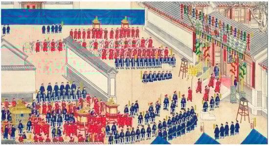 Despite the frequent changes in political power in China, the country’s cultural form has remained largely intact (Peng et al. 2022). During the establishment of the Qing dynasty (1644–1912), there was a continuation of the Six Rites system inherited from previous dynasties, along with the integration of distinct Manchu influences. The most notable change in Qing dynasty wedding rituals was the incorporation of Ming dynasty practices, combined with the addition of Manchu cultural customs. The fusion of these elements resulted in a diverse and inclusive wedding system that incorporated various aspects, including the ceremony process. The Qing Shi Gao 清史稿 provides detailed accounts of the wedding rituals and protocols for different social classes, including the emperor, crown princes, princesses, and high-ranking officials (Tong 1991). For instance, the illustration in Figure 3 of the “Complete Pictorial of Wedding Ceremonies” during the reign of Emperor Guangxu (1875–1908) depicts a grand procession for the bride’s welcoming, with imperial envoys sent on behalf of the emperor. Additionally, it was required that one day before the wedding, officials be sent to perform sacrificial rituals at the suburban altar and ancestral temple. In addition to the traditional and standardized Six Rites, there are additional steps specific to the imperial princes’ weddings. The prince and his bride must observe a nine-day post-wedding period known as “Gui Ning (歸寧)” before returning to their residence. In the case of princesses’ marriages, the Qing dynasty incorporated its own customs. After the marriage is arranged, the groom must go through a ritual similar to betrothal inquiries at the Meridian Gate. On the wedding day, it is strictly required for the groom’s family to pay respects at the Meridian Gate and present specific gifts known as the “Yi Jiu (一九)” ceremony, which includes a precise number of items such as 18 saddled horses, 18 sets of armor, 21 horses, 6 mules, 81 sheep, 45 bottles of milk wine and yellow wine, and 90 banquet tables. Finally, the princess must return to the palace and express gratitude after a nine-day post-wedding period. Therefore, in Qing Dynasty weddings, there was a significant association with political values. These ceremonies and regulations, which accommodated both Manchu and Han traditions, may have symbolized the endorsement and support of the Qing government.