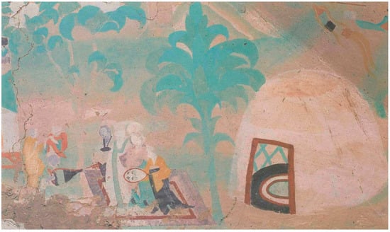 Figure 4. Depicts the “Qinglu” painting on the northern slope of Cave 186 in the Mogao Grottoes during the middle Tang Dynasty. Photo sourced from (Dunhuang Research Academy and Tan 2001).