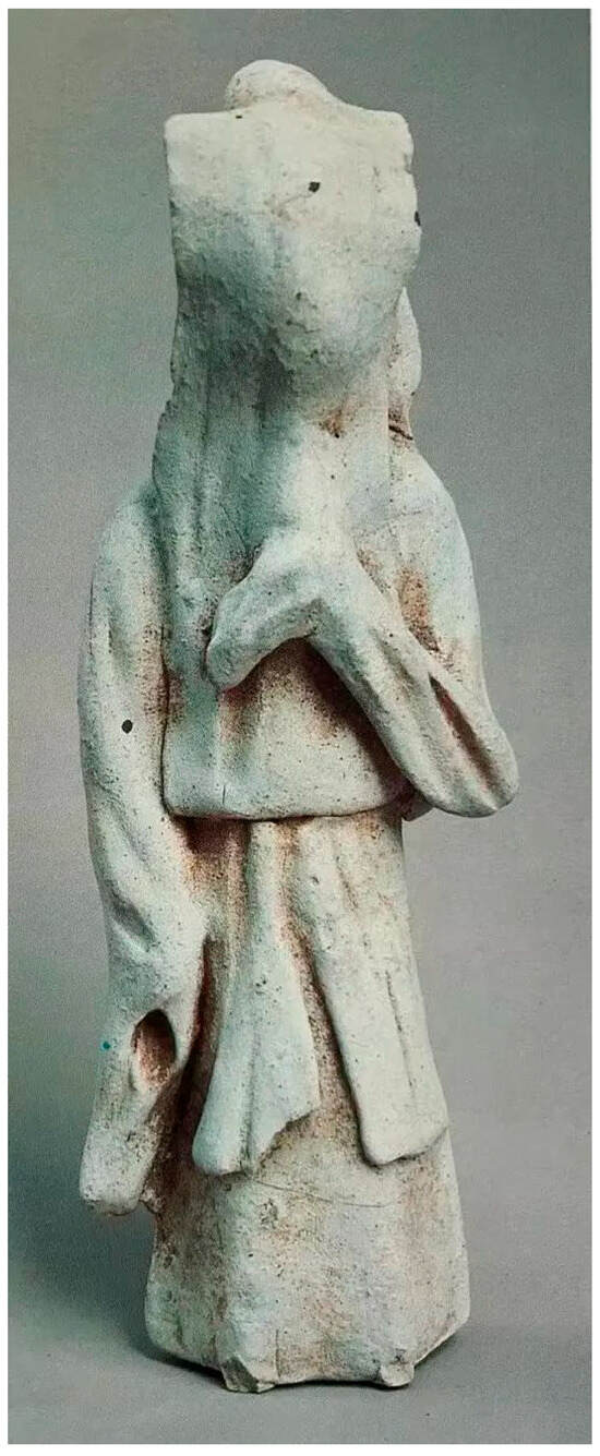 In fact, from the above-mentioned wedding customs, it is evident that wealth and material possessions also serve as symbolic representations to a certain extent. Confucianism emphasizes “respect (敬)” (Wu et al. 2022). The exchange of wealth during the wedding ceremony is also used as a gesture of “respect” between the families of the bride and groom, as well as within the associated communities. The custom of “xufujiaobai” (bride and groom’s mutual bow) further expresses this sense of respect between the couple. This activity involves the bride and groom bowing to each other on the wedding day, as recorded in the Sima Shi Shu Yi 司馬氏書儀 (Book of Rites by Sima Guang): “In ancient times, there was no custom of the bride and groom bowing to each other. It is only in the contemporary society that this practice began (Sima 1985)”. This indicates that this custom officially started during the Song Dynasty (960–1279). In the Southern Song period (1127–1279), according to the Mengliang Lu 夢梁錄 (Records of Dreams in Liangzhou), the ritual of mutual bowing became more elaborate, including the use of scales or machines to lift the bride’s veil. For example, female figurines found in the tomb of Hong Zicheng in Moyang County, Jiangxi Province, from the Southern Song Dynasty (1127–1279) were adorned with a narrow strip of cloth on their heads (Gao 2001), confirming the tradition of lifting the bride’s veil during the Southern Song period (see Figure 5).