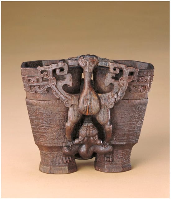 Figure 6. Depicts a rhinoceros horn carving of a combined cup with the motif of an eagle and a bear. It measures 13.2 cm in height, with a diameter ranging from 15 to 6.7 cm at the mouth and a foot diameter ranging from 10.4 to 3.4 cm. The cup is designed in a double-linked style, with an octagonal shape, slanted straight walls, and a high foot. Photo source: the official website of the Palace Museum16.
