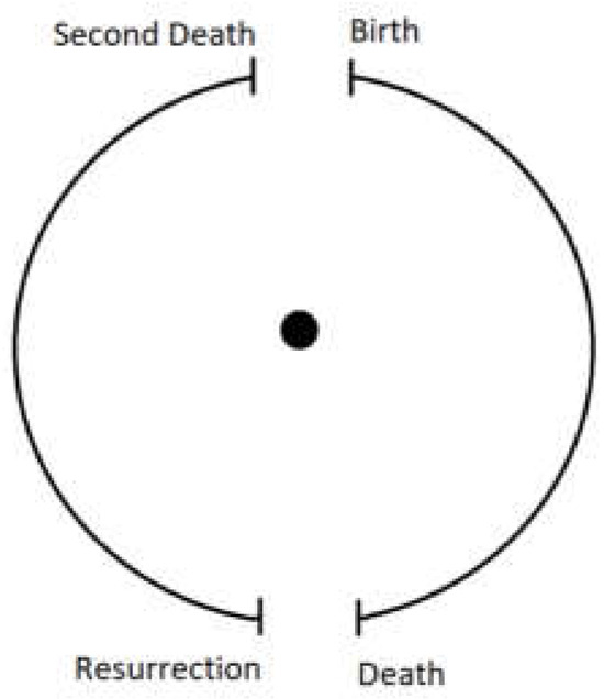 Now we can feather into this picture a commitment to the resurrection of the dead, without it constituting an interruption to your afterlife. Think of your life as comprised of two acts, separated by a temporal gap. Your afterlife still lies at the centre of the circle, such that each moment of each act of your life is equally present to you there, as in Figure 2.