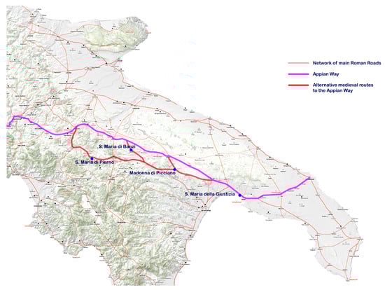 The following subsections are the results of a wider research that studies some local or regional attracting Marian shrines placed on the path of the Appian way or along its medieval variants (Trono and Oliva 2021) (Figure 1).