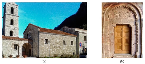 Monastic complex and sanctuary of Santa Maria di Pierno. (a) Detail of the southern façade with the entrance arch. (b) Main entrance portal to the church.