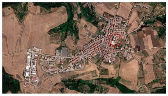 Aerial view of Banzi. The monastic complex and sanctuary of Santa Maria di Banzi is highlighted at the center of the residential area (Source: Google Maps 2023).