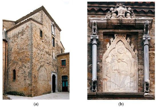 The porch with the church’s portal, the mature fruit of the assimilation of Romanesque plasticity and stylistic elements in the Apulian-Lucanian area with elements of peculiarity and innovation, can certainly be attributed to the intervention of the “magistro” Sarolo between 1189 and 1197. In the lunette, the adoption of mosaic spirals with a strong Byzantine reference is cleverly combined with the naturalistic high reliefs that frame the arch, infusing it with depth and emotion (Figure 3b) (Manchia 2017, pp. 83–89). The strong figurative association with coeval sculpture in the Gargano area of Puglia (especially those in the Marian churches of Calena and Pulsano) can be also related to the mobility of workmen and artisans along the main pilgrim route of the Appian Way that connected Rome to the shrines of St. Michael and St. Nicholas and the Adriatic Sea ports.