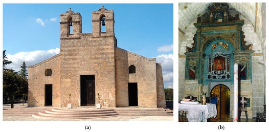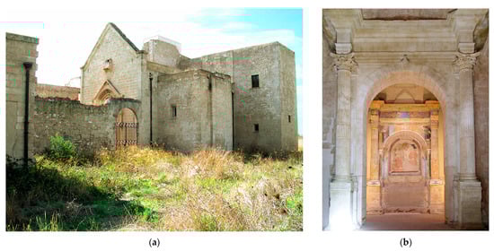 Today, substantial parts of the ancient complex are still visible, including the liturgical part, consisting of the bell tower, porch, and church, which was partially reorganised in the 16th century (Figure 3a); the monastic part, with some buildings; and the reception area, with the annexes and fountain.