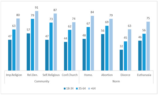 Community and norm variables by age group in Portugal in 2020 (%). Source: EVS (2021). Notes: Significant differences exist between all age groups. Tests: Imp.Religion—Fw (2) = 33.574, p < 0.001. Rel.Den.—Fw (2) = 49.106, p < 0.001. Self.Religious—Fw (2) = 52.876, p < 0.001. Conf.Church—Fw (2) = 27.968, p < 0.001. Homo—Fw (2) = 68.507, p < 0.001. Abortion—Fw (2) = 20.324, p < 0.001. Divorce—Fw (2) = 28.577, p < 0.001. Euthanasia—Fw (2) = 39.096, p < 0.001. In all, normality assumed, and homogeneity of variances not assumed.