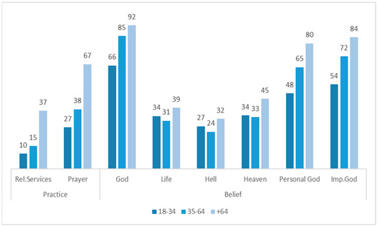 Practice and belief variables by age group in Portugal in 2020 (%). Source: EVS (2021). Notes: Significant differences exist between all age groups with the following exceptions: in Religious Services and beliefs in Life after death and Heaven, there are no significant differences between 18–34 and 35–64; in belief in Hell, there are significant differences only between 35–64 and +64. Tests: Rel.Services—Fw (2) = 28.328, p < 0.001. Prayer—Fw (2) = 53.217, p < 0.001. God—Fw (2) = 26.225, p < 0.001. Life—Fw (2) = 3.988, p = 0.019. Hell—Fw (2) = 4.231, p = 0.015. Heaven—F (2) = 8.330, p < 0.001. Personal God—Fw (2) = 30.240, p < 0.001. Imp.God—Fw (2) = 29.829, p < 0.001. In practice variables, normality assumed, and homogeneity of variances not assumed. In belief variables, normality assumed, and homogeneity of variances not assumed, except in Heaven where homogeneity of variances is assumed.