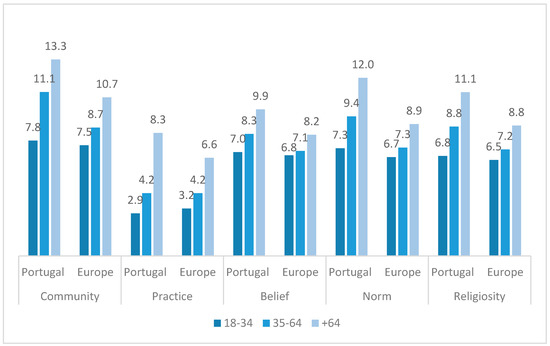Indexes of Portugal and Europe by age group in 2020. Source: EVS (2021). Notes: Indexes (Portugal/Europe) vary between 0 and 16. Significant differences exist between all age groups in Portugal and in Europe in all indexes except in belief in Europe where there are no significant differences between 18–34 and 35–64. Tests: Community—Portugal—Fw (2) = 65.565, p < 0.001; Europe—Fw (2) = 217.805, p < 0.001. Practice—Portugal—Fw (2) = 53.502, p < 0.001; Europe—Fw (2) = 243.229, p < 0.001. Belief—Portugal—Fw (2) = 20.811, p < 0.001; Europe—Fw (2) = 48.494, p < 0.001. Norm—Portugal—Fw (2) = 54.989, p < 0.001; Europe—Fw (2) = 115.439, p < 0.001. Religiosity—Portugal—Fw (2) = 76.528, p < 0.001; Europe—F (2) = 190.798, p < 0.001. In all, normality assumed, and homogeneity of variances not assumed, except in Religiosity in Europe where they are both assumed.