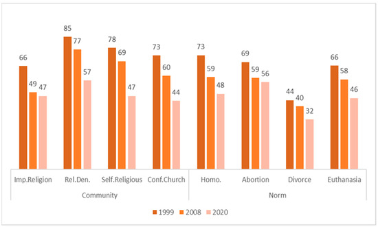 Looking at Figure 4 and Figure 5, all variables decrease gradually from 1999 to 2020, which confirms Hypothesis 2. The only exceptions occur once again in the eschatological beliefs (life after death and hell), where 2008 has the highest percentages. In the community dimension, importance of religion has small differences in 2008 and 2020. In the norm dimension, abortion has small differences in 2008 and 2020. In the belief dimension, between 1999 and 2020, while belief in life after death kept the same percentage, belief in hell slightly increased.