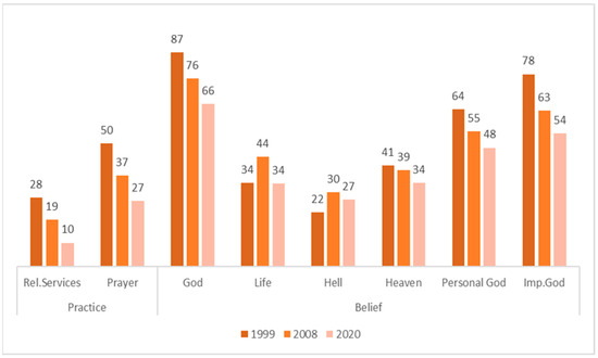 Practice and belief variables by round in Portugal in 2020 (%). Source: EVS (2021). Notes: Significant differences exist between all rounds with the following exceptions: in belief in Life after death, there are significant differences only between 2008 and 2020; in belief in Hell, there are no significant differences between all age groups; in belief in Heaven, there are significant differences only between 1999 and 2020; in belief in Personal God, there are no significant differences between 2008 and 2020. Tests: Rel.Services—Fw (2) = 20.242, p < 0.001. Prayer—Fw (2) = 19.593, p < 0.001. God—Fw (2) = 33.732, p < 0.001. Life—Fw (2) = 6.634, p = 0.001. Hell—Fw (2) = 2.491, p = 0.084. Heaven—Fw (2) = 3.012, p = 0.050. Personal God—Fw (2) =7.872, p < 0.001. Imp.God—Fw (2) = 21.550, p < 0.001. In all, normality assumed, and homogeneity of variances not assumed.