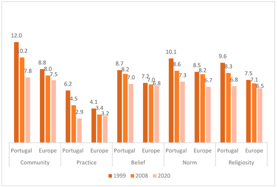 Indexes of Portugal and Europe by round in youth. Source: EVS (2021). Notes: Indexes (Portugal/Europe) vary between 0 and 16. Significant differences exist between all rounds with the following exceptions: in practice in Europe, there are no significant differences between 2008 and 2020; in belief in Portugal and norm in Europe, there are no significant differences between 1999 and 2008; in belief in Europe, there are significant differences only between 1999 and 2020. Tests: Community—Portugal—Fw (2) = 44.514, p < 0.001; Europe—F (2) = 37.391, p < 0.001. Practice—Portugal—Fw (2) = 25.977, p < 0.001; Europe—Fw (2) = 20.667, p < 0.001. Belief—Portugal—Fw (2) = 8.350, p < 0.001; Europe—Fw (2) = 2.977, p = 0.051. Norm—Portugal—F (2) = 20.121, p < 0.001; Europe—Fw (2) = 76.676, p < 0.001. Religiosity—Portugal—Fw (2) = 37.861, p < 0.001; Europe—Fw (2) = 36.822, p < 0.001. In all, normality assumed, and homogeneity of variances not assumed, except in Community in Europe and Norm in Portugal where they are both assumed.