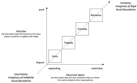 Forchtner et al. (2020) have demonstrated that, in Western societies, these four narrative genres—romance, comedy, tragedy and irony (Frye 1957)—can constrain (romance and comedy) or trigger (tragedy and irony) the inclusion of “Others” by delimiting or expanding the set of legitimate actors, perspectives and arguments in a discourse. Tragic and ironic emplotments allow for emancipatory and inclusionary critique by calling naive presumptions of the in-group’s purity into question, they induce mechanisms for inclusionary social reorganization. In contrast, romantic and comic emplotments stifle emancipatory and inclusionary critique by portraying an idealized, undivided in-group threatened by a troubling “Other”, set in an unambiguous, black-and-white plot. In the latter genre, argumentative exchange flows within the boundaries delimited by the “good” people (in-group), while (counter)arguments by othered interlocutors are preemptively discarded by the genre’s us–them moral dichotomy (see Forchtner et al. 2020, p. 207). In romances, “the good guys are clearly good from the outset: they wear the white hats while the bad guys wear the black hats” (Wagner-Pacifici 1986, p. 282). Consequently, tragic and ironic emplotments foster the enactment of Habermasian discourse presuppositions which allow for text-level communication in new formations of social relations beyond pre-existing boundaries, while comedy and romance impede such enactment and manifest the social boundaries between “the good us” and “the bad them”.