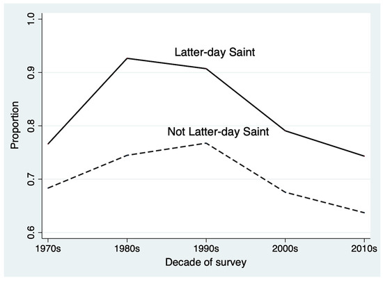 The General Social Survey (GSS) (https://gss.norc.org), accessed on 1 January 2020) provides the data needed to test these hypotheses. Our study includes data from surveys conducted between 1974 to 2018, with all cases drawn from a cumulative data file (N = 52,851). The outcome variable was the question, “Do you favor or oppose the death penalty for persons convicted of murder?” with the response categories of “favor” or “oppose.” Religious groups analyzed included Latter-day Saint, Catholic, conservative Protestant, mainline Protestant, Black Protestant, other religion, and no religion, which is generally consistent with RELTRAD coding (Steensland et al. 2000), albeit with LDS broken out separately for analytical purposes. Other variables included were gender, marital status, employment status, region (including Southern native, rural native, and lives in Mountain Census Region, the last of these due to regional Mormon concentration), race/ethnicity (Caucasian, African American, Latino, and other race/ethnicity), political party preference (Democrat, Independent, Republican), political ideology (liberal, moderate, conservative), number of children, education in years, family income, religious service attendance, age, and the decade during which the surveys were administered (1970s, 1980s, 1990s, 2000s, and 2010s). See Table 1 for demographics, including percentages and means of the variables. Binary logistic regression was used to estimate the associations between the key independent variable (religious group) and the dependent variable (death penalty favorability), net of the potentially confounding influence of control variables (Hoffmann 2021).