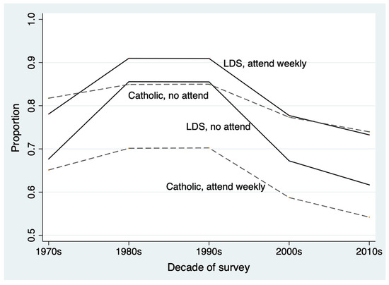 Proportion supporting the death penalty among Latter-day Saints and Catholics, by decade of survey and religious service attendance, General Social Surveys, 1974–2018. Note: the predicted values are based on a model that includes all the variables listed in Table 3.