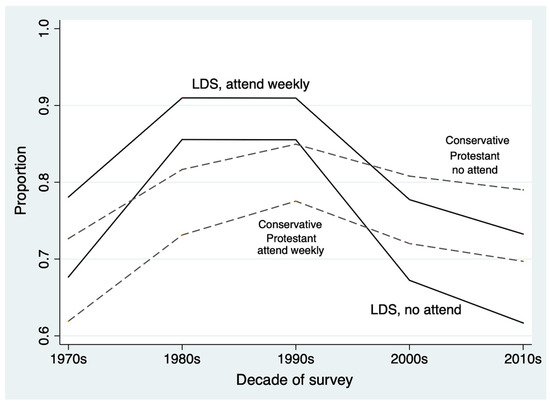 Proportion supporting the death penalty among Latter-day Saints and conservative Protestants, by decade of survey and religious service attendance, General Social Surveys, 1974–2018. Note: the predicted values are based on a model that includes all the variables listed in Table 3.