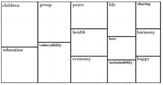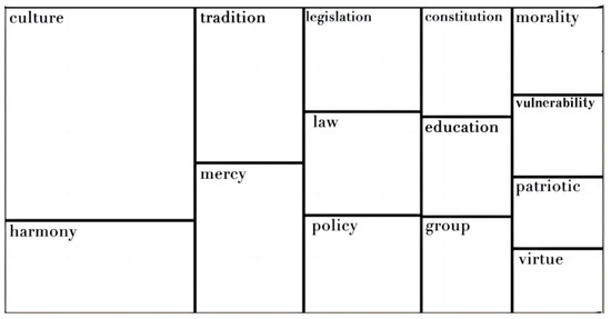 As for self-identification and its public expression in service practice, there were some differences between Protestant and Buddhist social services. We entered the organizational goals, missions, purposes, and values of 127 Protestant and Buddhist foundations into the NVivo software for analysis, and the following three differences were found. First, there were different core values. The Protestant social service value was clearly embodied as “love” (Figure 1), while in the public expression of Buddhist social services, “mercy” appeared many times (the fourth word frequency), highlighting the Buddhist value of compassion (Figure 2). Second, Protestant social service values were open and cosmopolitan, while Buddhist social service values were traditional and localized. As an international faith, Protestant social service emphasized broader values beyond the home, such as peace, sharing, and the world. In our analysis of the public expression of Buddhist social services, tradition (counts 32, weighted percentage 1.38) and culture (counts 76, weighted percentage 3.27) were closely combined. The term traditional culture (word frequency count 12) and the value of Buddhist social service have been internalized as a part of Chinese traditional culture after a long history of evolution. Third, the expression and prominence of political consistency were different. Protestant social services rarely had clearly political claims and expressions; in terms of public expression, they highlighted concern for vulnerable groups, respect for life, and yearning for a better life. Protestant social service public expression was closely integrated with the micro goal of social service. The political direction of Buddhist social services was very clear; in terms of the mission, purpose, and goal of the organization, Buddhist social services lay great stress on abiding by the Constitution, laws and regulations, and national policies, also putting forward clear requirements on patriotism and social morality.