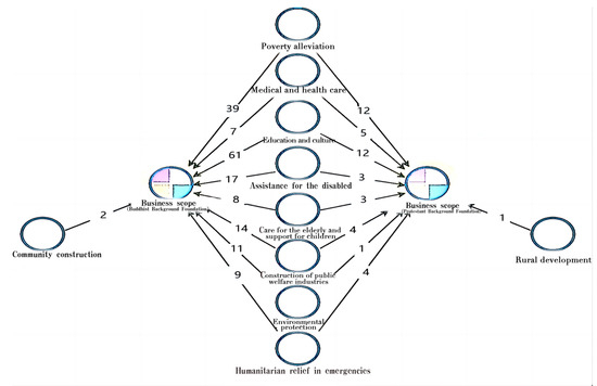 In terms of service business scope, after collating the public information of 112 Buddhist background foundations and 15 Protestant background foundations and coding it with NVivo software, we found that the scope of social service activities and projects covered a relatively wide range, and in the field of services, the two types of foundations had similar service areas. The first-level codes include (a) humanitarian relief in emergencies; (b) medical and health care; (c) care for the elderly and support for children; (d) education and culture; (e) construction of public welfare industries; (f) poverty alleviation; (g) assistance for the disabled; and (h) environmental protection (Figure 3). In comparison, the unique service area of Buddhist background foundations was community construction; the specific area of service for Protestant background foundations was rural development. The top four service areas of Buddhist background foundations were education and culture (sixty-one references), poverty alleviation (thirty-nine references), assistance to the disabled (seventeen references), and construction of public welfare industries (fourteen references). The top four service areas of Protestant background foundations were poverty alleviation (twelve references), education and culture (twelve references), medical and health care (five references), public welfare industry construction (four references), and humanitarian relief in emergencies (four references). “Education and culture,” “poverty alleviation,”and “construction of public welfare industries” were the top four codes in the business scope of the two types of foundations and occupied the mainstream position in the business scope of the two types of foundations.