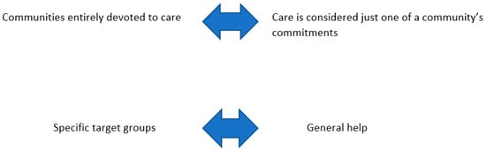 In light of these presuppositions, Christian communities of care are communities that—definitely flawed, and different from one congregation to another—practice care, both as a habit that has been acquired over time, and as public expressions of their faith. It is important to note the spectrum of kinds of care, differences in intensity in terms of time, means and people involved, the specific focus care might have locally, or the degree in which the community as a whole is characterized by being a community of care. To discern these differences, a continuum (Figure 1 and Figure 2) can be helpful as a heuristic tool.