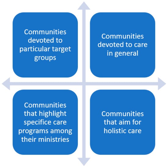 Christian communities have given countless examples of these four kinds of communities of care, both in the past and in the present. The two examples listed above are just examples of a current re-invention or rediscovery of the intense value that, especially Christian, communities of care have in the current context of a post-Christian secular West. They function as an inspiration to figure out what their specific calling in their context might be, either individually or as a community. HvV has had an impact far beyond the community: the mayor of the city, the Dutch minister for health, and several delegations from abroad have visited HvV to learn from it (Tamminga 2020, pp. 100–8).