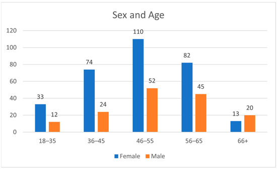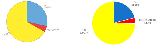 Most respondents (162; 35%) were aged 46–55, and, in all age categories other than the oldest (66 or older), most were women (Figure 1). Over two-thirds of respondents (310/465; 67%) said yes in response to Q4 asking whether they had a religion or followed any personal spiritual practices. Less than a third (133; 29%) said no, and a small number (22; 4%) indicated that they preferred not to say (Figure 2).