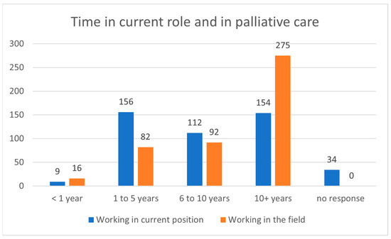 Most respondents (275; 59%) had been working in palliative care for more than ten years. About a third of respondents had been in their current positions for either over ten years (155; 33%) or 1–5 years (156; 34%), with a few (43; 9%) having been in their current positions for over 20 years (Figure 3).