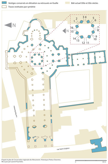 Abbey of Saint-Sauveur de Charroux, plan and reconstruction of the ruined abbey church constructed ca. 1050–ca. 1096; inset, upper right: detail of the organization of the columns of the rotunda tower (Photo by permission: © Région Nouvelle-Aquitaine, Inventaire général du patrimoine culturel. © Conservation régionale des monuments historiques, Poitiers. Jean Jay, 2011).