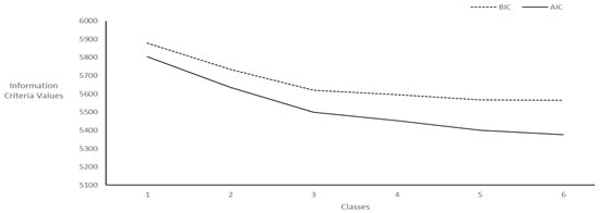 Plot of information criteria values to determine number of profiles. Note: BIC = Bayesian Information Criterion. AIC = Akaike Information Criterion.