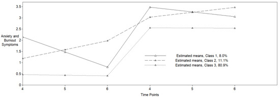 We set the nonsignificant variance of the slope for anxiety to zero to aid convergence, thereby approximating latent trajectory analysis rather than remaining a growth mixture model (Jung and Wickrama 2008). A plot of information criterion values showed a “point of ‘diminishing returns’ in model fit,” (Nylund-Gibson and Choi 2018, p. 443; see Figure 1) at the three-class model. As such, we opted for interpreting the three-class model. Entropy for the three-class model was 0.85, suggesting good subgroup separation and classification accuracy, and the average posterior class probability (AvePP) values were adequate (≥0.69). Class 1 reported the highest levels of anxiety and work-related burnout symptoms and showed improvement over time (see Figure 2). Class 2 reported moderate levels of symptoms and showed deterioration over time. Class 3 reported the lowest levels of symptoms, a small decline in anxiety, and no change in burnout.