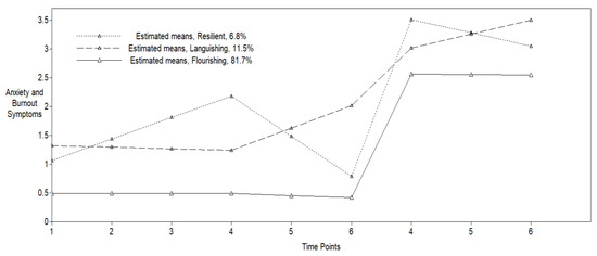 Plot of the estimated means for the sensitivity analysis for the piecewise parallel growth mixture model. Note: N = 751. First line segment = plot of anxiety scores for times 1–4, second line segment = plot of anxiety scores for times 4–6, third line segment = plot of work-related burnout for times 4–6. Scale range for anxiety 0–3, and for burnout 1–5. Slope 2 variance set to zero to aid convergence. Below are the intercept and slope means for each trajectory, SE = standard error. Resilient: anxiety intercept = 1.06, SE = 0.27, p < 0.001; slope1 = 0.37, SE = 0.09, p < 0.001; slope2 = −0.70, SE = 0.08, p < 0.001; burnout intercept = 3.51, SE = 0.12, p < 0.001; slope = −0.23, SE = 0.12, p = 0.049. Languishing: anxiety intercept = 1.32, SE = 0.24, p < 0.001; slope1 = −0.03, SE = 0.10, p = 0.78; slope2 = 0.39, SE = 0.07, p < 0.001; burnout intercept = 3.01, SE = 0.09, p < 0.001; slope = 0.24, SE = 0.07, p < 0.001. Flourishing: anxiety intercept = 0.49, SE = 0.04, p < 0.001; slope1 = < 0.001, SE = 0.01, p = 0.99; slope2 = −0.04, SE = 0.01, p = 0.005; burnout intercept = 2.56, SE = 0.03, p < 0.001; slope = −0.01, SE = 0.02, p = 0.69.