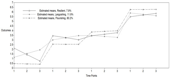 Plot of the estimated means from the sensitivity analysis for the parallel growth mixture model. Note: N = 751. First line segment = plot of anxiety scores, second line segment = plot of work-related burnout, third line segment = plot of life purpose, fourth line segment = plot of gratitude. Resilient class: anxiety intercept = 2.12, SE = 0.14, p < 0.001; slope = −0.69, SE = 0.08, p < 0.001; burnout intercept = 3.46, SE = 0.11, p < 0.001; slope = −0.22, SE = 0.08, p = 0.01; life purpose intercept = 3.45, SE = 0.13, p < 0.001; slope = 0.17, SE = 0.06, p =0.005; gratitude intercept = 5.50, SE = 0.20, p < 0.001; slope = 0.18, SE = 0.09, p = 0.04.
