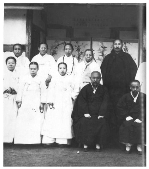 Korea during this period was plagued with internal corruption and the persistent inroads made by foreign powers against the impotent Chosŏn court. The common people, especially peasants, suffered from the oppression, plundering, exploitation, and extortion carried out by the aristocratic class and the wealthy local families. Around this time, new religious movements, such as Tonghak 東學 and Chŭngsan’gyo 甑山敎4, gained popularity with the common people for their emphasis on establishing an egalitarian Korean society. Indigenous Korean religions called this transitional period: “Closing the earlier heaven and opening a later heaven” (Chung 2003, p. 6). The era of the earlier heaven (sŏnch’ŏn 先天) was characterized by extreme absurdity, immaturity, strong exploiting the weak, a life of dependence, an authoritative father and men, separation and division, inequality, and injustice. In contrast, the era of the later heaven (huch’ŏn 後天) was characterized by the cooperation of the strong and the weak, peace, self-sufficiency, rationality, equality, justice, advancements in scientific civilization, and prosperity (Baker 2019, p. 299). These indigenous Korean religions called for an ushering of a Great Transformation (kaebyŏk 開闢), an age when the earlier heaven (the waning period of the Chosŏn dynasty) would be replaced with the later heaven to establish a genuinely civilized and enlightened world.