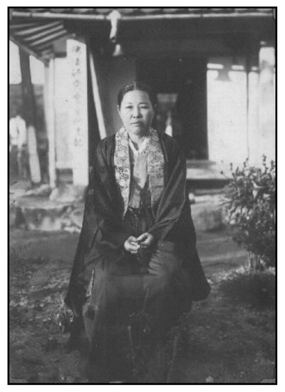 Yi Chŏngch’un 李靑春 was born on 26 March 1886, the youngest of three daughters in Chŏnju, located in the southwest region of Korea. She was a vivid and affectionate child, but losing her father at a young age led to a turbulent and unstable childhood (Wŏnbulgyo Pŏphunnok 1999, p. 142). Living in underprivileged conditions led her to the kisaeng life. Yi Chŏngch’un’s years as a kisaeng are undocumented, which is reasonable given the overwhelming silence surrounding the kisaeng in Korea’s official histories (Kim 1976, p. 144). Extant historical documents often lament her early ‘disgraceful’ kisaeng life. However, it is argued later that her kisaeng years were crucial in shaping her life philosophy and preparing her for leadership in Wŏn Buddhism.