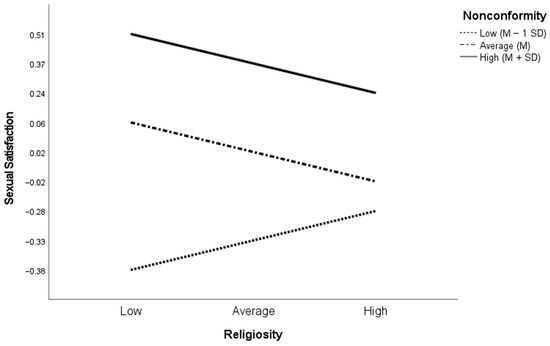 The moderation analysis revealed a significant moderating effect of nonconformity on the relationship between religiosity and sexual satisfaction (β = −0.09, 95% CI [−0.163, −0.025], p = 0.007). Specifically, religiosity was negatively related to sexual satisfaction when nonconformity was high (M + 1SD) (β = −0.14, 95% CI [−0.239, −0.041]). By contrast, the relationship between religiosity and sexual satisfaction was insignificant for low (M − 1 SD) (β = 0.05, 95% CI [−0.050, 0.149]) and average (M) (β = −0.06, 95% CI [−0.130, 0.012]) values of nonconformity (see Figure 1).
