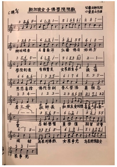 In the inaugural address, Master Chuk Mor contextualized the genesis of SGBI as a constituent of the modernization movement of Chinese Buddhism in Singapore and a continuation of institutional Buddhist female education in pre-war mainland China (Nanyang Shangbao 1962). Analogous to the foundation of Buddhist seminaries by women in Greater China during the twentieth century, the intentions of SGBI were to espouse both religious and gender pursuits. The primary objective of the initiators was to “uplift the education of underprivileged girls in local temples and provide a platform for young Buddhist women to delve into advanced Buddhist studies” (Nanyang Shangbao 1959). As was manifest in the school anthem (Figure 2), which Master Chuk Mor composed for SGBI, the school’s purpose was to “promote Buddhist teachings” while concurrently endeavoring to “win glory for Singaporean Buddhist women”.