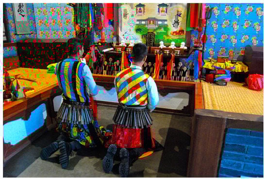 The ethnographic data show that there are four categories of sacrifices among historical Manchus. The first is regular and calendarial rites which are performed in festivals during the year. The most important rite is the spring and autumn sacrifice. The second is called shaoguanxiang 烧官香 (meaning public-insane-burning), which is performed when the clan encounters disasters such as floodings, epidemics, or earthquakes. If no catastrophe occurs, the clan usually holds the public-insane-burning every five years or approximately ten years. The sacrifice is usually performed on a large scale, and all clan members distributed everywhere are asked to participate. The third is the haunyuan sacrifice for healing or problem-resolving. It can be held on any day and for any family in need. The fourth is the xupu 续谱 (meaning continuation of clan genealogy) sacrifice, held for the updating of clan ancestral archives (). However, according to ongoing fieldwork, the yearly regular rites are rarely practiced nowadays among most Manchu clans, while the public-insane-burning or xupu sacrifices with a longer cycle are still practiced. The cycle and frequency of the rite vary among Manchu clans. Clans in the Jiutai County of Jilin Province, such as the Shi clan, Yang clan, and Zhao clan, perform the xupu sacrifice in the tiger year or dragon year in the Chinese lunar calendar once every 12 years. The public-insane-burning is usually combined with the xupu rite (; ). For the Guan clan of Yilangang Village in the Ningan County of Heilongjiang Province,24 members follow the rule of performing a small-sized public-insane-burning rite every three years and a grand public-insane-burning rite every five years (; ; ; ). Additionally, sacrificial rites are also performed for scholars for the academic observations, or for the public as a part of the governmental Intangible Cultural Heritage Project. Obviously, this is a new category which responds to the social need of the contemporary changing world (Figure 1).